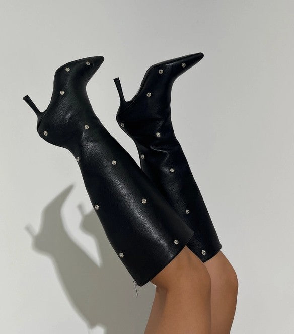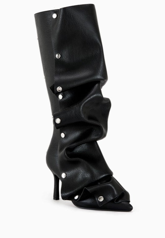 This girl is a total statement maker, featuring our iconic slouch and silver snaps combo to make all of your styling dreams come true. The lux black faux leather, knee high design, and stiletto heel serve edge to your everyday.