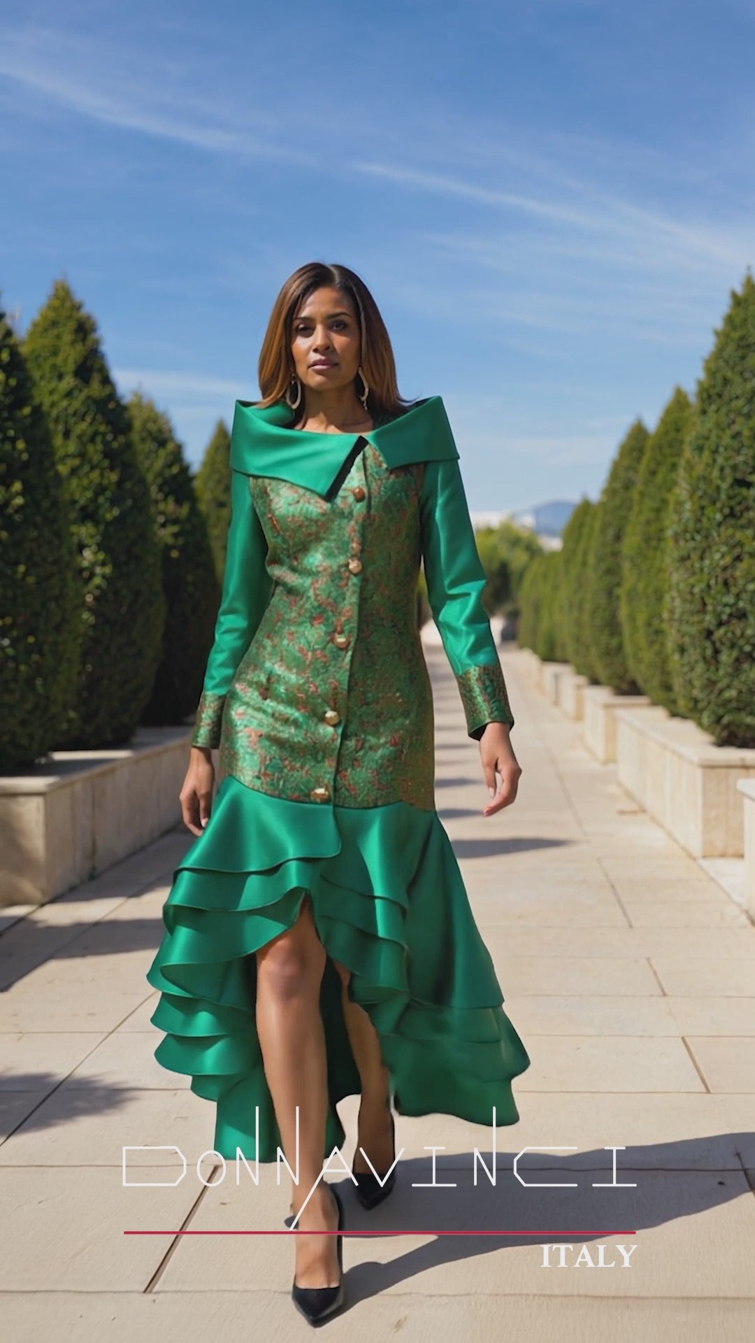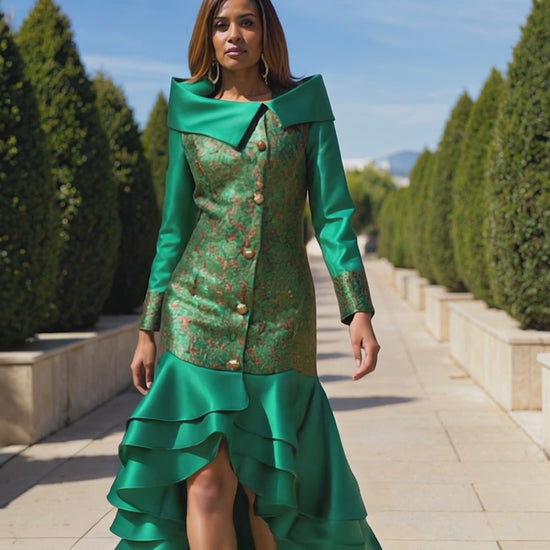 Novelty Brocade Fabric & Forest Virtual Silk, Trimmed With Rhinestone & Gold Hardware Buttons.